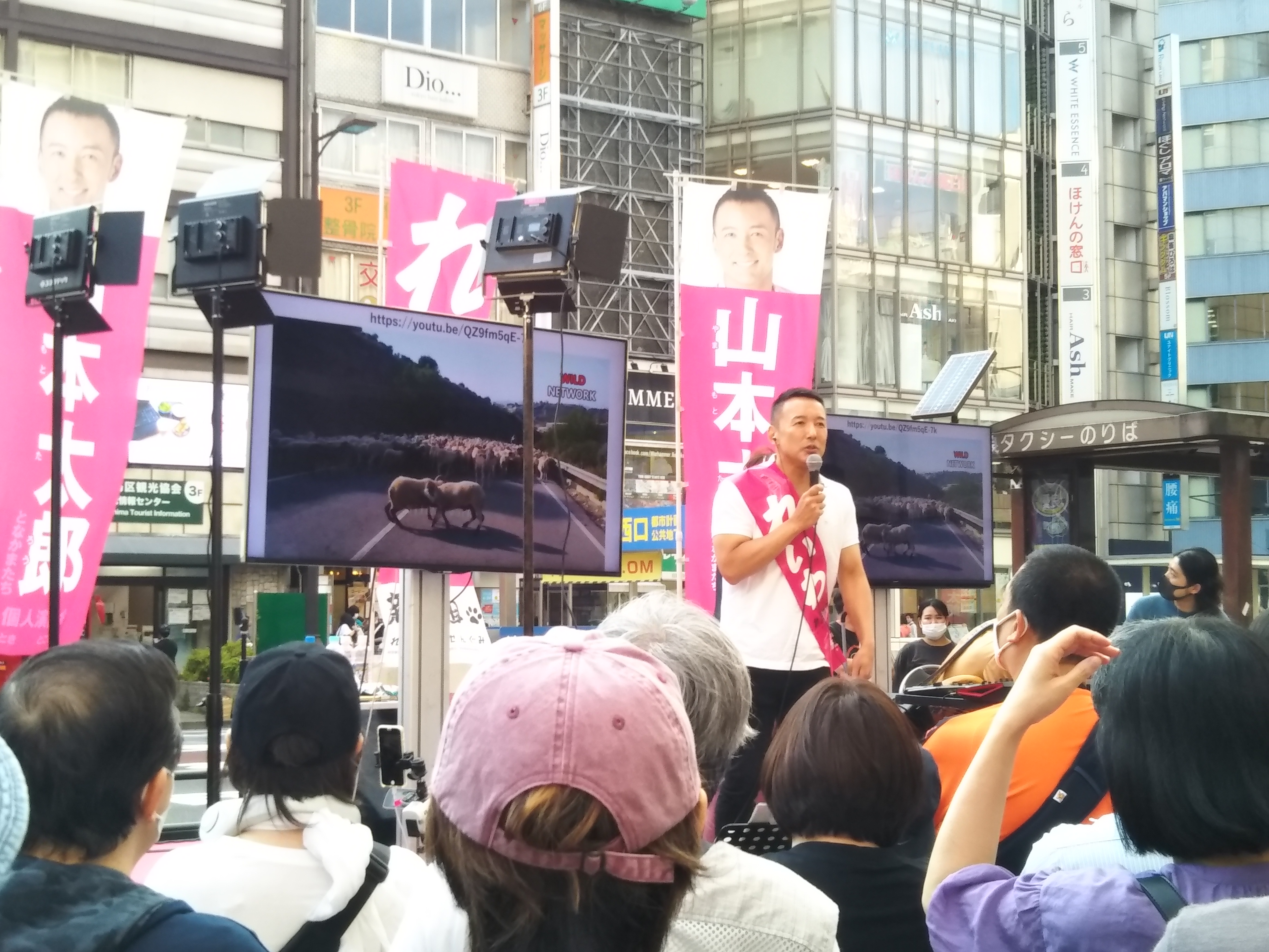 池袋西口に戻ってきたときには、15時を少し過ぎてしまった。マツモトキヨシ付近というよりも、もっと正面寄りというか、広場になっているところにステージが作られていて、バンドが演奏をしている。ギャラリーの群れに加わり、見物しやすいポジションを確保しようと、写真を撮るのに逆光にならない、やや下手側に立った。しかし、この演奏がなかなか終わらない。日差しがきついところで、ただ突っ立っているのもきついものだ。15時半になり、ようやく変化があり、ステージ上に設置されたモニターにはれいわ新選組のプロモーション映像が流れ、山本太郎が登場した。ステージの脇には、水道橋博士のすがたもすでに見える。山本太郎の演説というか口上というか、独特な節をもつスピーチから始まると、ギャラリーの輪の外側からさっそく怒鳴りつけるような声が飛ぶ。なにを言っているのかと思ったら、「日本のゼレンスキーになれ!」と応援しているのだった。連呼しているので、山本太郎もさすがに無視はできず、最初は不審に思ったようだが、好意の声だとわかると笑顔で応じていた。だけど、先日、玉城デニーの発言が批判されたばかりだというのに、日本のゼレンスキーとは危なっかしい応援もあるもんだ。そして、山本太郎とともに今日の司会を務めるという、大石あきこも登場する。詳しくは知らないが、維新を激しく批判しているのがこのひとだ。れいわについての予備知識はほぼない状態でこの場にやってきているのだが、山本太郎が司会をやるのはわかるが、大石あきこというひとも話が上手い。元大阪府職員という肩書きしか知らないが、なぜこんなに話が上手いのだろう。明るく、政治家臭さがないのも長所だと思った。